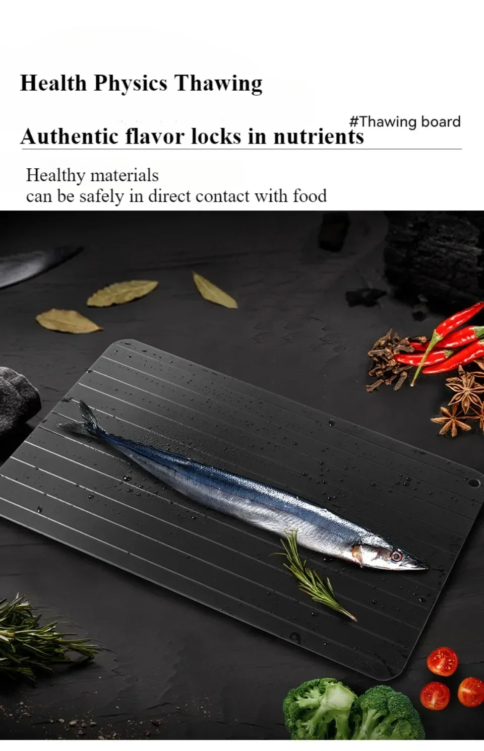 Dank der Wärmeleit-Technologie taut es Fleisch, Geflügel und Fisch auf natürliche und sichere Weise auf – ganz ohne Strom oder Mikrowelle – und bewahrt den ursprünglichen Geschmack der Lebensmittel.“